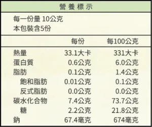 品名:星光大稻-醬燒海苔米點星 成份:糙米、白米、蔗糖、醬油(水、海鹽、黑豆、紅冰糖、麥芽糖)、海苔粉、玫瑰鹽、芝麻油 淨重:50公克 產地:台灣 出品:德昇國際開發有限公司 地址:台北市信義區松仁路101號12樓 電話:02-85223123 分機 108 食品業者登錄字號:A-124552066-00000-8 產品責任險字號:新安東京產物保險1702013ML000948 保存期限:6個月(未開封) 保存方式:請放置陰涼乾燥處,避免陽光照射開封後盡速食用完畢,避免受潮。 本產品含大豆、芝麻不適合對其過敏體質者食用。 警語:內附乾燥劑或脫氧劑,不可食用。 營養標示: 商品評價 目前沒有評價。 只有註冊並且購買過商品的顧客才能撰寫評價。