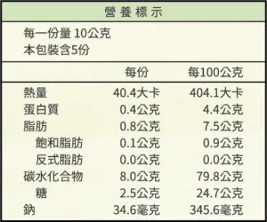 首頁/米點星系列/伴手禮 / 禮盒/米點星 黑糖玫瑰鹽 5% OFF 米點星 黑糖玫瑰鹽NT$189 原始價格:NT$189。NT$180目前價格:NT$180。 無麩質,非油炸 健康米零食,送禮自用兩相宜 .100%使用台灣國產米 .無添加 / 非油炸 / 無調味 .入口三秒鐘,融化在舌尖 米點星 黑糖玫瑰鹽 數量 加入購物車 分類: 伴手禮 / 禮盒, 米點星系列, 自家烘焙 品牌: 星光大稻, 穀米寶貝 描述 評價 (0) 品名:星光大稻-黑糖玫瑰鹽米點星 成份:糙米、白米、黑糖、玫瑰鹽、芝麻油 淨重:50公克 產地:台灣 出品:德昇國際開發有限公司 地址:台北市信義區松仁路101號12樓 電話:02-85223123 分機 108 食品業者登錄字號:A-124552066-00000-8 產品責任險字號:新安東京產物保險1702013ML000948 保存期限:6個月(未開封) 保存方式:請放置陰涼乾燥處,避免陽光照射開封後盡速食用完畢,避免受潮。 本產品含穀物、芝麻不適合對其過敏體質者食用。 警語:內附乾燥劑或脫氧劑,不可食用。 營養標示: 商品評價 目前沒有評價。 只有註冊並且購買過商品的顧客才能撰寫評價。 相關商品 5% OFF 米點星 醬燒海苔 NT$189 原始價格:NT$189。NT$180目前價格:NT$180。 加入購物車 5% OFF 米點星 黑豆巧克力 NT$189 原始價格:NT$189。NT$180目前價格:NT$180。 加入購物車 5% OFF 米點星 原味綜合 NT$189 原始價格:NT$189。NT$180目前價格:NT$180。 加入購物車 5% OFF 米點星 原味草莓 NT$189 原始價格:NT$189。NT$180目前價格:NT$180。 加入購物車